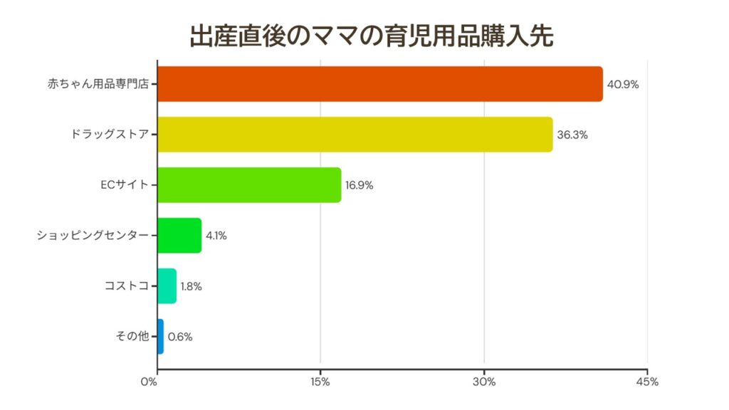 出産直後のママ2,825人へのアンケートによると、育児用品の主な購入先第1位は「赤ちゃん用品専門店」で約40%。おむつや哺乳瓶、洋服など、必要なものをひと通り揃えられることに加え、知識豊富なスタッフに相談できる安心感から、まずは専門店を選ぶママが多いと考えられます。