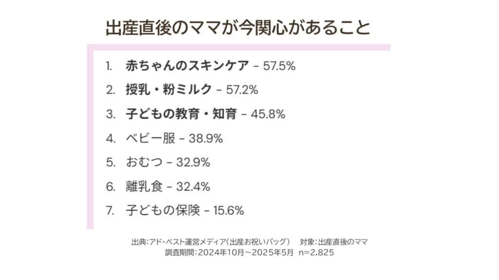 また、子育て初期からスキンケアや教育など育児全体への関心が高く、興味関心の幅が広がっていることも明らかに。これからは、買い物の便利さだけでなく、専門的な情報やママ同士のリアルな声を届けることがますます重要になりそうです。
