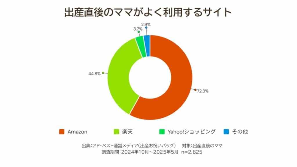 育児用品の主な購入場所に「ECサイト」を選んだママに、よく使うサイトを聞いたところ『Amazon』が72.3%で圧倒的1位でした。配送の早さや買いやすさ、おむつや日用品を定期便システムで買えることなど、便利さが信頼を集めているようです。